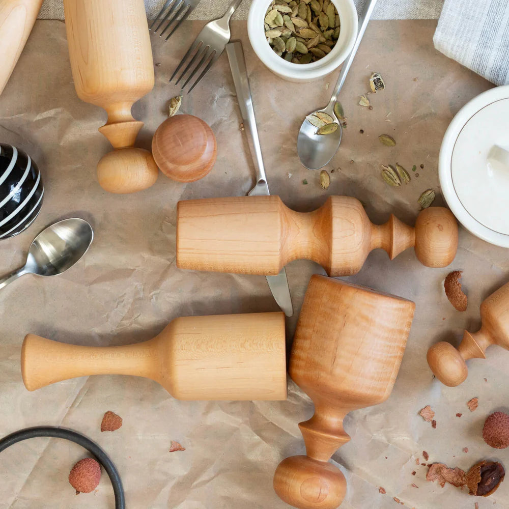 Inspired by a vintage find, Astro's antenna-like top offers a retro-modern look reminiscent of a particular robot in the 1960s TV series The Jetsons. Its straight sides make it versatile for tasks like rolling dough or crushing spices and nuts. Astro makes a design statement whether displayed alone or grouped together.
